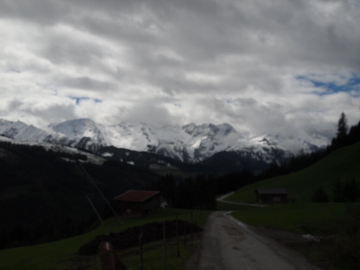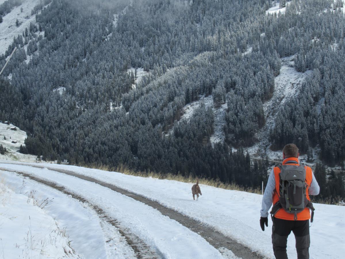 Boven aan gekomen besloten om te lopen via de Pröller Alm, omdat de Rössl Alm dicht was. Het was goed te lopen met al die regen en de sneeuw op de normale paden, dwars door het bos was het heel nat. Bij de afslag naar beneden naar de Pröller Alm bleek dat toch wel heel nat en glad was. Dat het stijl was dat wisten we van andere jaren. Dus maar besloten om de normale weg terg naar Gerlos te gaan.