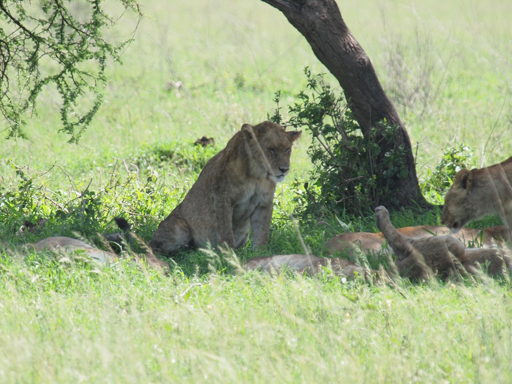 Dus weer onderweg zoeken naar dieren. Voor we het wisten stonden we weer, bijna, oog in oog met een groep leeuwen. Een 10 stuks die zich, schijnbaar, net te goed hadden gedaan aan een lekker stuk vlees. De gieren en de hyena’s genoten nog van de restanten.