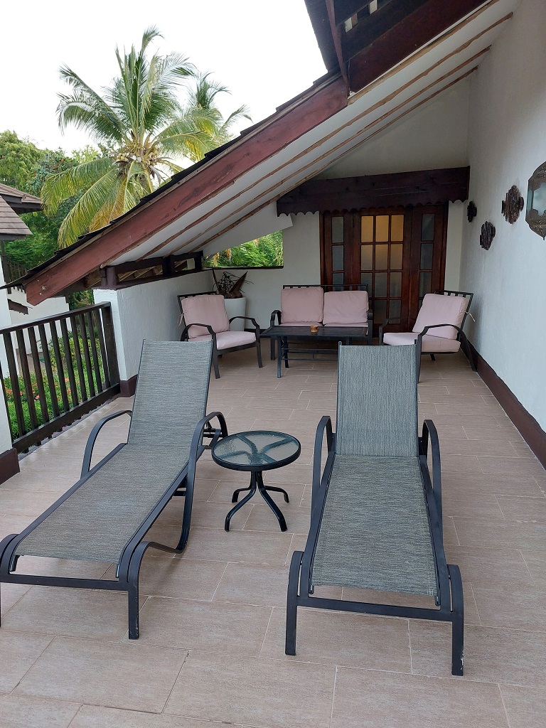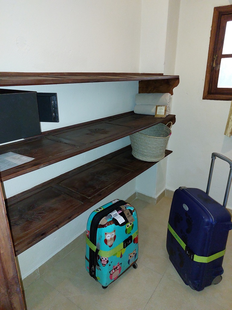 Dit ziet er echt wel sjiek uit. Krijgen we ter plekke te horen dat ze ons een “upgrade” hebben gegeven. We zouden 2 kamers beneden hebben, maar hebben nu 2 kamers boven. Onder ons zitten 4 kamers. We hebben een kleedkamer (foto 3), grote badkamer (foto 2), zeer ruime woonkamer met slaapkamer (foto 5) en een groot balkon met aan de zijkant van onze slaap/woonkamer een apart overdekt zitje (foto 4). Hier kunnen we het de komende dagen wel uit houden.
